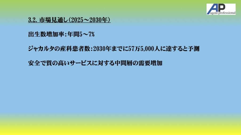 ➀魅力的な人口・分娩市場:出生数増加を見込んでいる地域での開業は今後の産科事業においては必須です。そして日本とも友好な関係国であることとGDPの高さから検討するとインドネシアは海外進出にとっても産科施設開業にとってもベターな国であると考えられます。